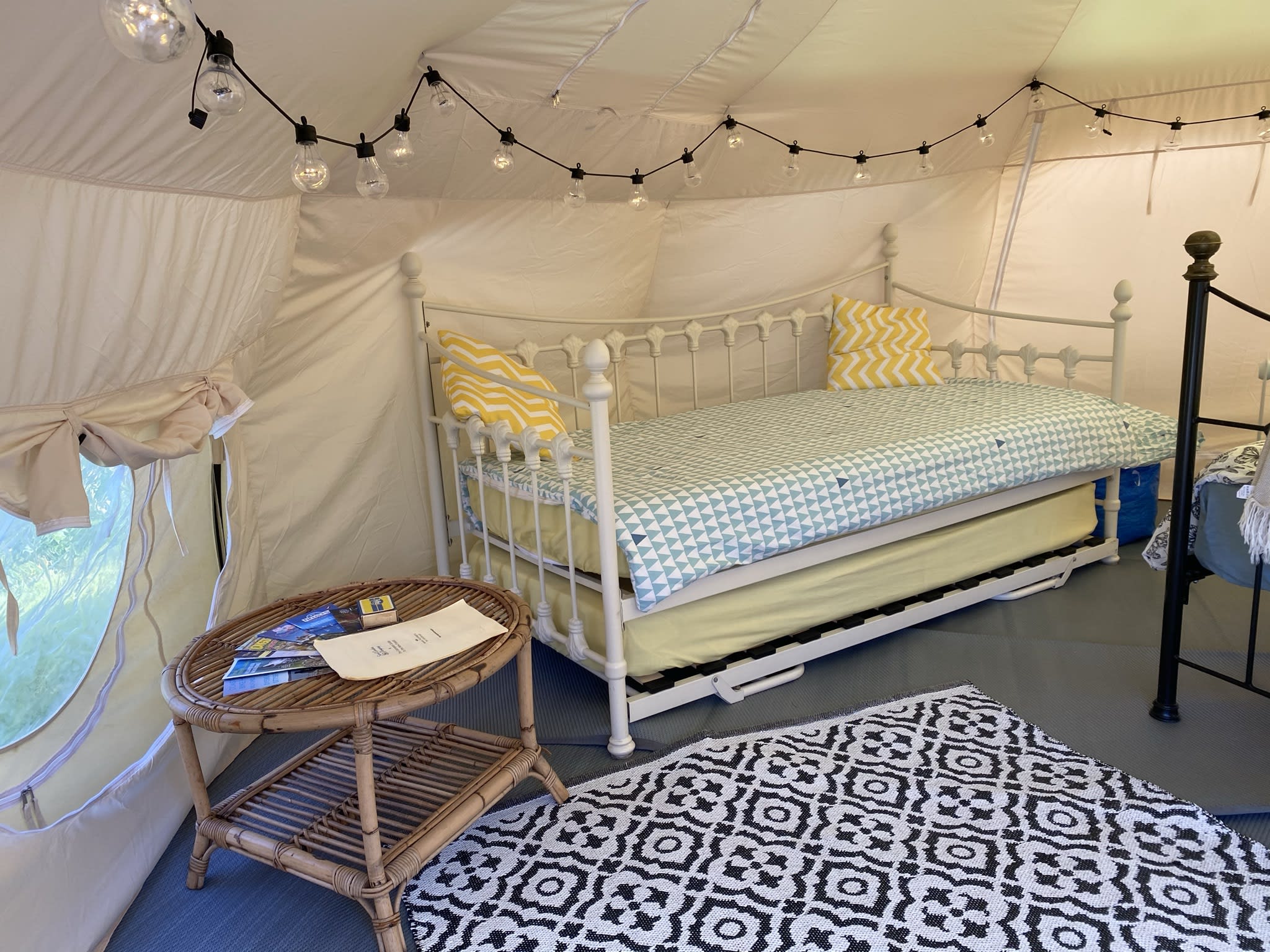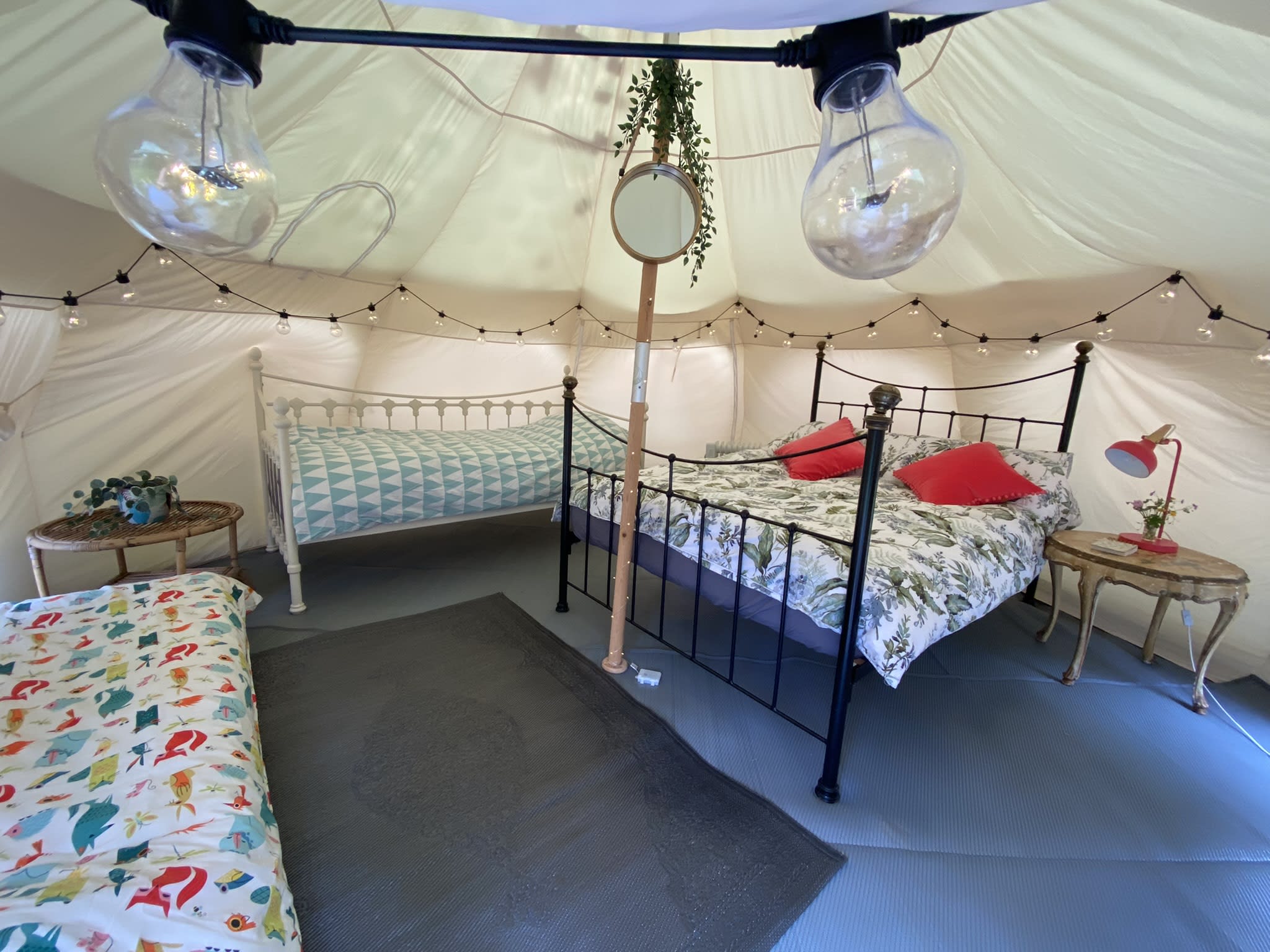 We had a wonderful stay at the secret garden, it was beautiful space surrounded by trees, lots of ground for our 2.5 years son to run around and play. Tent was spacious and beautifully set up. Facilities were clean, comfortable and easy to use. Fridge is available which is great. Hosts are are kind, generous and very sociable, shared useful information about places to visit and explore. We knew from previous reviews that this space is in the garden space of residential home, but it is such big and beautiful quite space, you would not even know you are only 10-15 min walk to town center, leading to Marina. It was a perfect stay for us, so much to see and do around the area. If night are cold it is fresh in a tent, but there is a heater and duvets are warm, so it was all good.